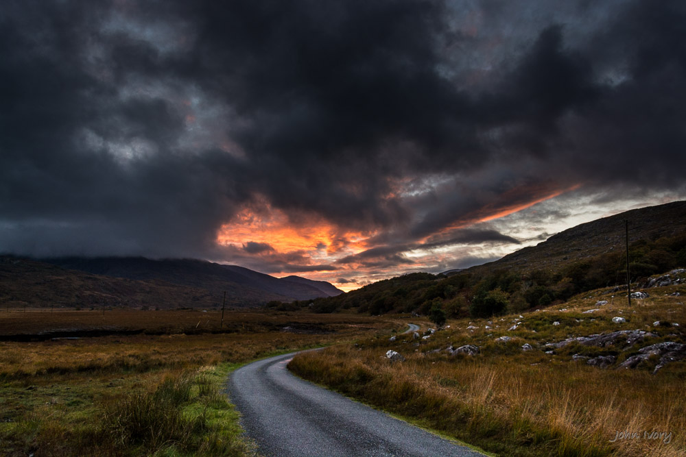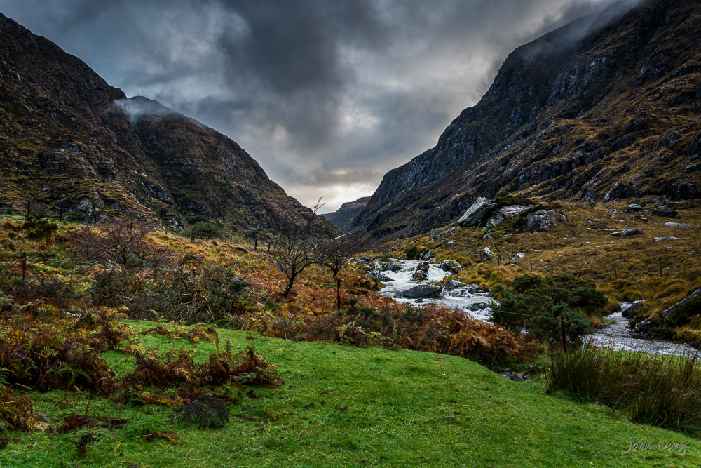 The Black Valley in County Kerry, is a remote location in the Macgillycuddy’s Reeks situated south of the Gap of Dunloe and north of Moll’s Gap. While it is geographically close to the bustling town of Killarney, its ‘roads’ are not suited to the ubiquitous tour buses, so you will usually get a sense of just how remote it is. It is stunningly beautiful and is well worth a diversion from the well-worn tourist routes of the Ring of Kerry. The valley forms part of the Kerry Way, a walkers version of the Ring of Kerry beginning and ending in Killarney. It is also noted for being the last place in Ireland to be connected to the electricity and telephone networks due to its remoteness. The connection happened in 1978, according to a CIE Tour Guide.